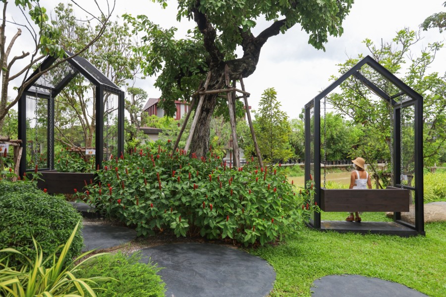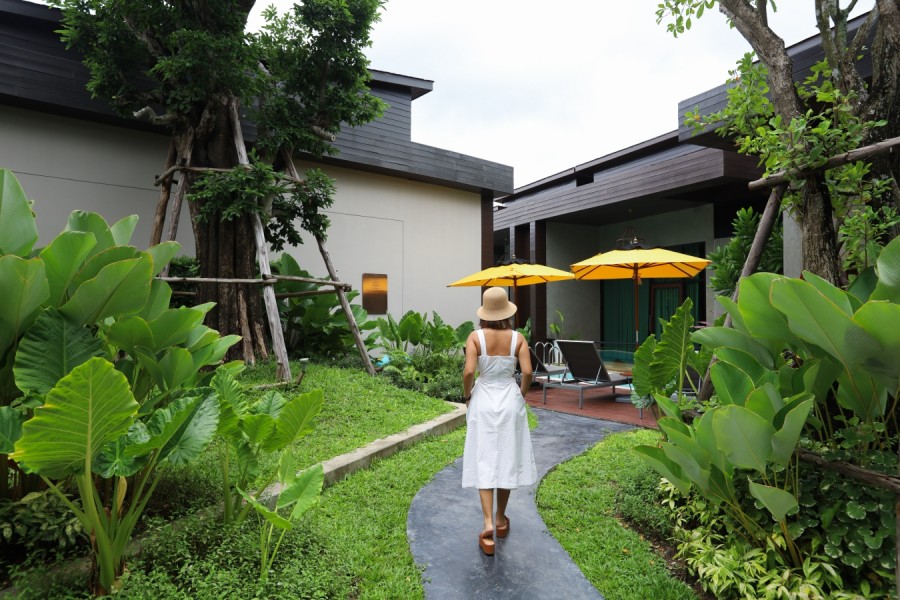 บรรยากาศภายในที่พัก มีพื้นที่สีเขียวดูสบายตา ดีไซน์ที่พักเรียบหรูแต่ดูแพง ทั้งภายในและภายนอก