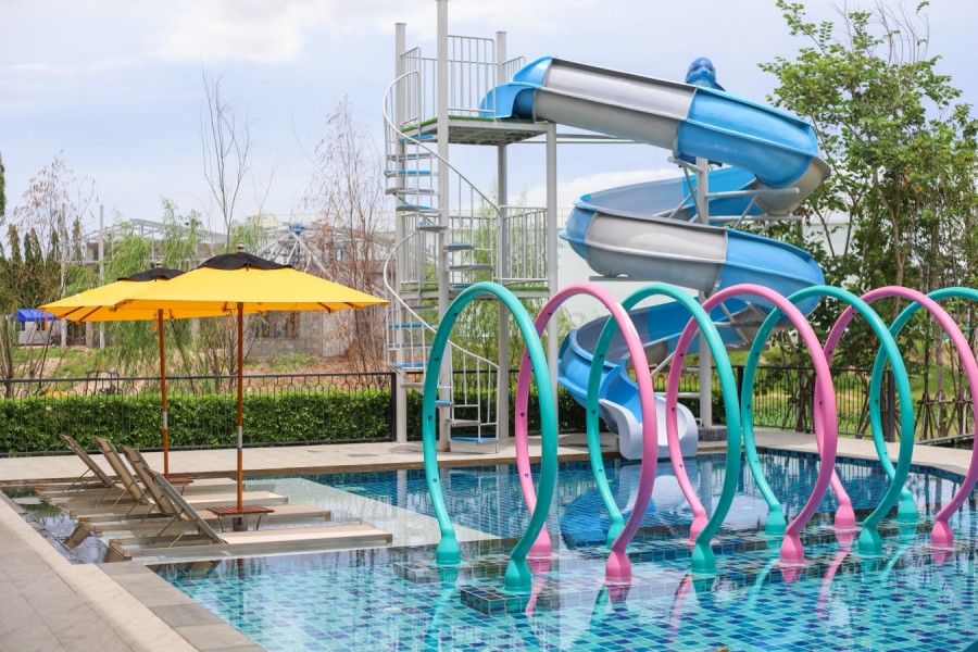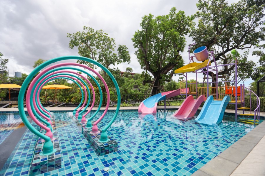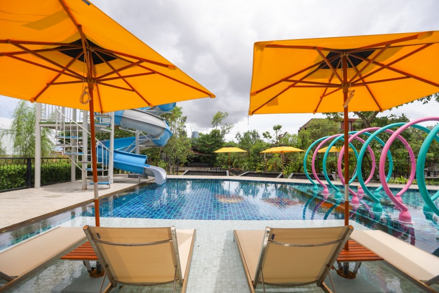 สำหรับสายแฟมิลี่ ที่มีน้องๆ หนูมาพัก สามารถมาเล่นสวนน้ำ ส่วนกลางของที่พักได้เลย รับรองว่าเล่นเพลินแน่นอน