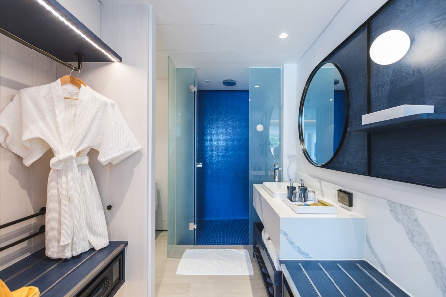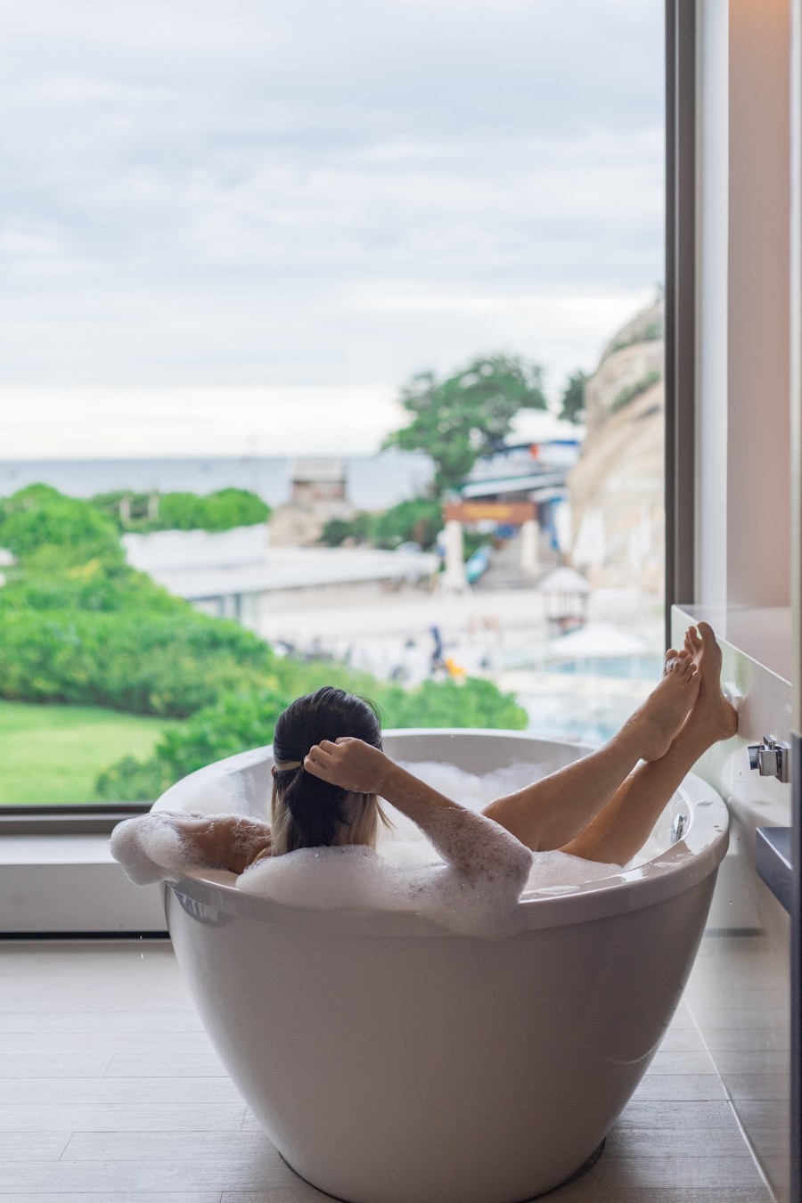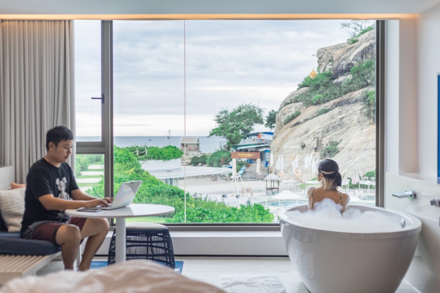 และอ่างอาบน้ำ ที่มองเห็นวิวทะเล สิ่งอำนวยความสะดวกในห้อง มีให้บริการครบครัน