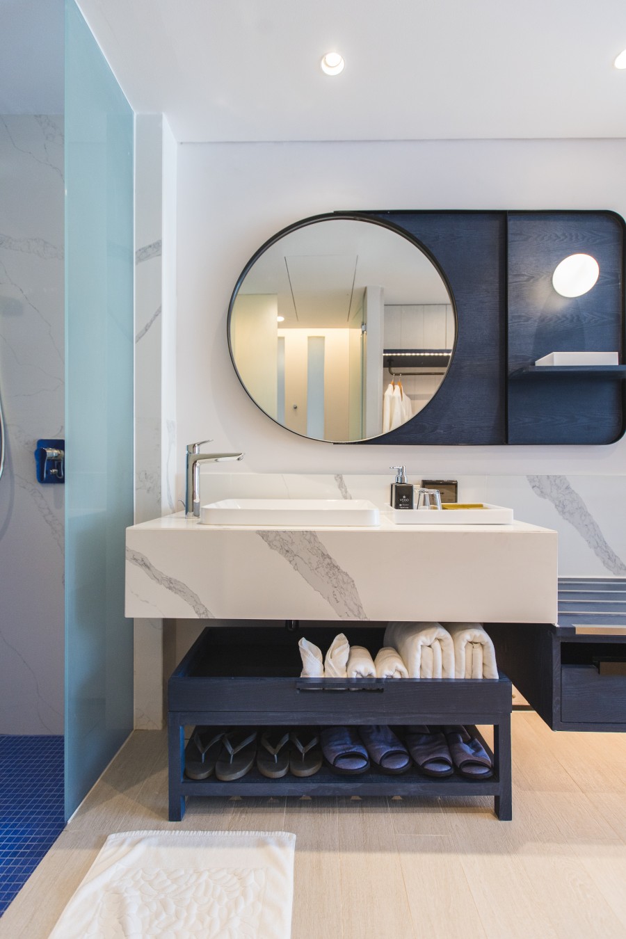 ทริปนี้ เราได้พักกัน ที่ ห้อง OCEAN FRONT ภายในห้องตกแต่งโทนฟ้าขาว เตียงนอนมีขนาดใหญ่ มองเห็นวิวทะเล
