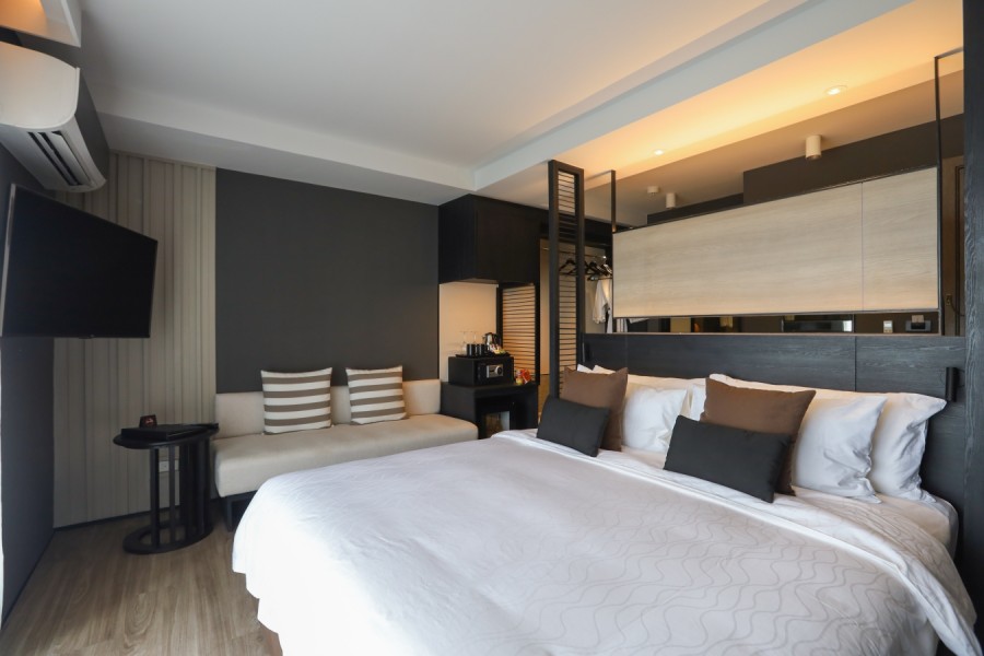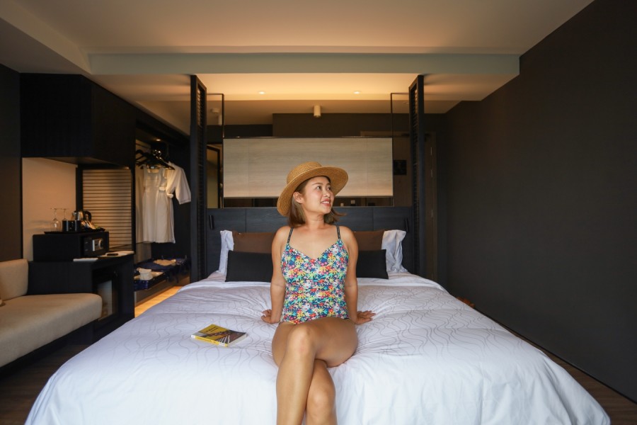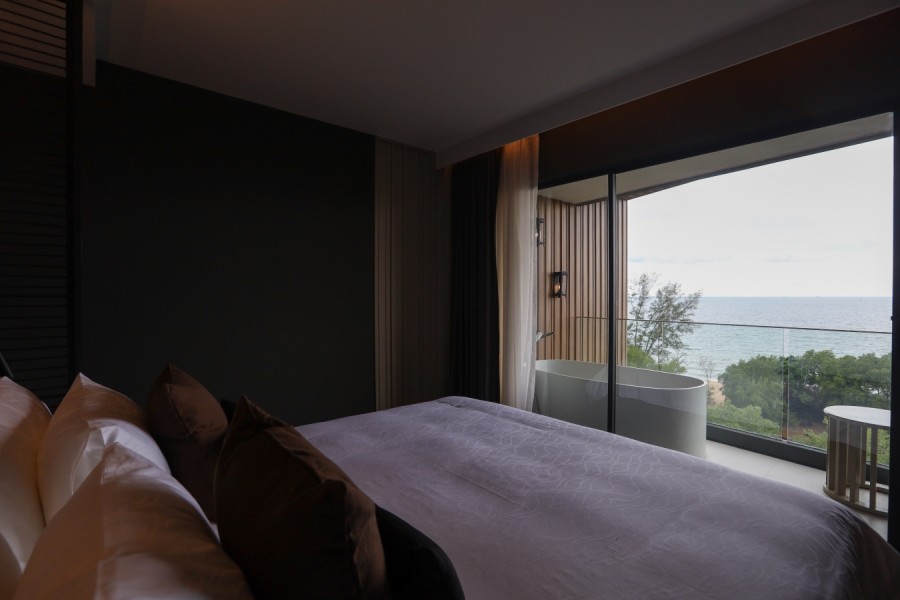 ห้องพัก ที่เราพักห้อง เอ็กเซ็กคูทีฟ (Executive Room) ตกแต่งสไตล์โมเดิร์น เตียงขนาดใหญ่ นอนแช่อ่างชมวิวทะเลริมระเบียง
